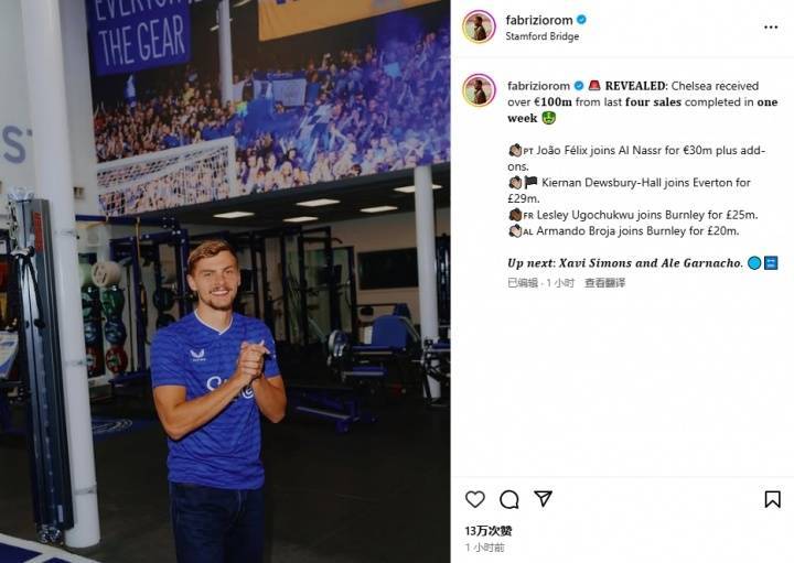 罗马诺表示,最近的4笔签约,切尔西收入超过1亿欧,在一周左右便完成。分别是菲利克斯去胜利(3000万欧)、霍尔去埃弗顿(2900万镑)、乌戈丘库去伯恩利(2500万镑)、布罗亚去伯恩利(2000万镑,未官宣)。